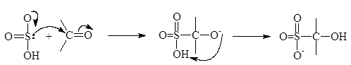 Альдегиды и простейшие метилкетоны взаимодействуют с концентрированным раствором дисульфита натрия с образованием кристаллических веществ, обычно называемых дисульфитными производными альдегидов и кетонов. Дисульфитные производные плохо рстворимы и используются для отделения альдегидов и кетонов. Присоединение происходит в результате нуклеофильной атаки дисульфит-иона по карбонильному атому углерода с последующим присоединением иона водорода по карбонильному кислороду. Доказано, что дисульфит-анион реагирует местом с наибольшей нуклеофильной силой (по атому серы), а не местом с наибольшей электронной плотгностью (атом кислорода):