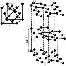 Устойчивая при обычной температуре модификация углерода - графит - представляет собой непрозрачную, серую жирную массу. Алмаз - самое твердое вещество на земле - бесцветен и прозрачен. Кристаллические структуры графита и алмаза приведены на рис.1.