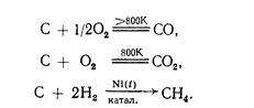 Углерод инертен, но при очень высокой, температуре (в аморфном состоянии) взаимодействует с большинством металлов с образованием твердых растворов или карбидов (СаС2 , Fе3 С и т.д.), а также со многими металлоидами, например: