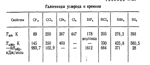 Свойства галогенидов углерода приведены в табл.6. Из галогенидов углерода самое большое значение имеет-бесцветная, достаточно токсичная жидкость. В обычных условиях ССІ4 химически инертен. Его применяют как невоспламеняющийся и негорючий растворитель смол, лаков, жиров, а также для получения фреона CF2 CІ2 (Ткип = 303 К):