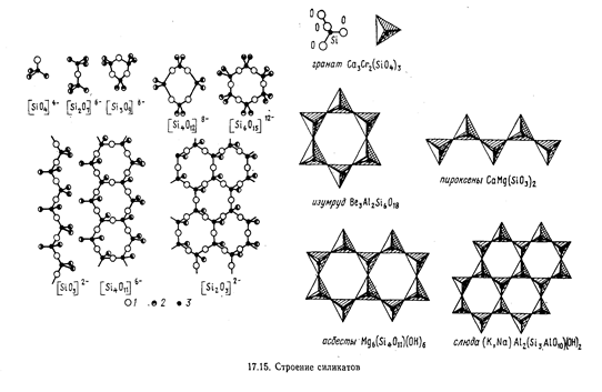 Известно большое разнообразие силикатов (точнее, оксосиликатов). В строении оксосиликатов наблюдается определенная закономерность: все состоят из тетраэдров Si04 , которые через атом кислорода соединены друг с другом. Наиболее распространенными сочетаниями тетраэдров являются (Si2 O7 6 - ), (Si3 O9 ) 6 - , (Si4 0l2 ) 8- , (Si6 O18 12 - ), которые как структурные единицы могут объединяться в цепочки, ленты, сетки и каркасы (рис 4).