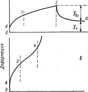 На рис.1 представлено развитие общей деформации при низком и высоком постоянных напряжениях сдвига. Первые участки приведенных зависимостей (отрезок ОА) соответствуют условно-упругой деформации, т.е. успевшей развиться за время приложения нагрузки высокоэластической деформации. Второй участок на кривых рис.1, ограниченный первой вертикальной пунктирной линией, соответствует достижению предельной высокоэластической деформации; при малой нагрузке (рис. 1, а) наряду с этим происходят незначительные изменения структуры, и начинается установившееся течение. Снятие малой нагрузки в любой момент времени приводит к релаксации высокоэластической деформации и фиксации развившейся необратимой деформации.