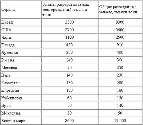 Типы месторождений. Молибден относится к редким элементам, его кларк в земной коре равен 1,1·10-4 % по массе. Кроме того, оценено общее содержание его во Вселенной (5·10-7 % по массе или 10-8 % от общего количества атомов), на Солнце (9·10-7 % (масс) или 10-8 % (ат)), углеродистых метеоритах (1,2·10-4 (масс) или 2,5·10-5 % (ат)), морской воде (10-6 % (масс) или 6,4·10-8 % (ат)), речной воде (8·10-8 % (масс) или 8·10-10 % (ат)). В природе этот металл встречается только в виде соединений, известно около двух десятков его минералов, среди которых наиболее важны молибденит (MoS2 ), повелит (CaMoO4 ), молибдо-шеелит (Ca (Mo,W) O4 ), молибдит (xFe2 O3 ·yMoO3 ·zH2 O) и вульфенит (PbMoO4 ). Промышленное значение имеет только молибденит. Молибденовые руды принято делить по минеральному составу и форме рудных тел на жильные (кварцевые, кварц-серицитовые и кварц-молибденит-вольфрамитовые), прожилково-вкрапленные (кварц-молибденит-серицитовые, медно-молибденовые, медные порфировые с молибденом), скарновые (молибденовые, вольфрамо-молибденовые и медно-молибденовые). Серицит - природный алюмосиликат. Скарны - это породы, образовавшиеся на контакте известняков и кислых магматических пород типа гранитов, богатых кварцем. Медно-порфировые месторождения представлены породами, в которых кварцевые жилы с молибденитом образуют прожилки в измененной породе. Раньше наибольшее промышленное значение имели кварцевые жильные месторождения, сейчас жильные месторождения, в основном, выработаны и ценны прожилково-вкрапленные и скарновые месторождения. Более 60% запасов молибдена и около 70% его добычи приходится на медно-молибден-порфировые месторождения. Из них молибден добывается попутно с медью.