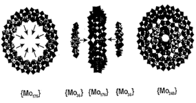 Это гигантская наноразмерная сфера (диаметр около 25 ангстрем), построенная из более чем 500 атомов молибдена и кислорода, имеет икосаэдрическую симметрию.12 вершин икосаэдра заняты атомами молибдена фрагментов {MoO7 }, которые в свою очередь связаны с 5 октаэдрами {MoO6 } через общие ребра.30 биядерных фрагментов Mo2 связывают эти кластерные фрагменты, и из таких простых структурных фрагментов образуется сфера. Она имеет такие большие размеры, что внутри ее могут свободно разместиться несколько таких относительно больших молекул как фуллерен С60 .