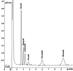 Зразок проби насосом подається на детектор, який реєструє збільшення електропровідності, що відбувається за рахунок певних іонів, які розподіляються на аналітичній колонці і виходять по черзі за ступенем спорідненості до активних центрів смоли. Першими виходять однозарядні іони, пізніше двозарядні. Загальний час аналізу становить 20 хвилин.