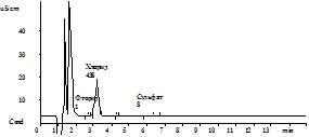 З хроматограми (рис.3) видно, що з 4 зразків тільки один зразок “Боржоми” можна вважати мінеральною водою. Аніонний склад задовольняє заявленому на етикетці (Додаток А).