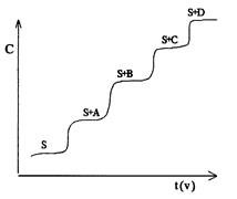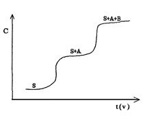 Фронтальный метод - простейший вариант хроматографии. Он состоит в том, что через колонку с адсорбентом непрерывно пропускают анализируемую смесь, например, компонентов А и В в растворителе S (рис. 1). В растворе, вытекающем из колонки, определяют концентрацию каждого компонента и строят график в координатах "количество вещества - объем раствора", прошедшего через колонку. Эту зависимость обычно называют хроматограммой или выходной кривой. На выходе из колонки собирают раствор, называемый элюатом. Вследствие сорбции А и В сначала из колонки будет вытекать растворитель S, затем растворитель и менее сорбируемый компонент А, а затем растворитель, компонент А и компонент В. Таким образом, удается выделить в чистом виде лишь один компонент смеси - наименее сорбируемый. Фронтальному методу отвечает хроматограмма вида (рис. 3.).