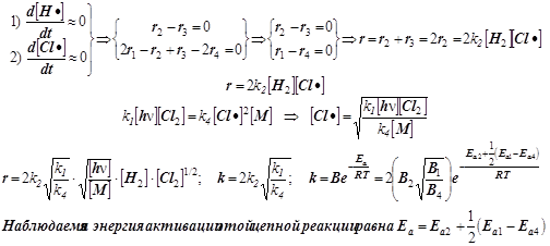 7) При выводе скорости r всего процесса используем два уравнения для квазистационарных концент раций свободных валентностей® радикальных частиц® атомов H• и Cl•: