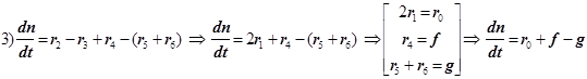 1) Цепной разветвлённый процесс есть результат суперпозиции стадий четырёх типов: зарождения, продолжения, разветвления и обрыва. На стадии продолжения число активных центров остаётся неизменным. Поэтому желательно в уравнении 3) от неё избавиться, и сосредоточиться на трёх основных стадиях, конкуренция которых формирует специфику именно разветвлённого процесса.