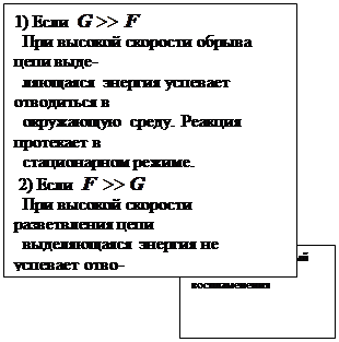 Полученное выражение предсказывает два предельных режима изменения концентрации активных центров, (см. рис.): а)-при доминирующем обрыве цепи система стационарно насыщается активными центрами; б)-при доминирующем разветвлении активные центры способны неограниченно накапливаться.