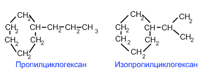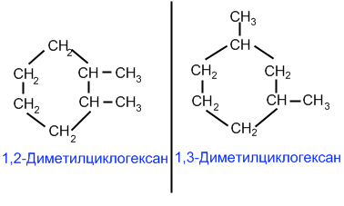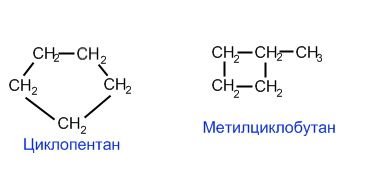 Структурная изомерия для циклоалканов, во-первых, обусловлена размером цикла. Так, существует два циклоалкана формулы С4Н8: циклобутан и метилциклопропан. Во-вторых, такая изомерия обусловливается положением заместителей в цикле (например, 1,1 и 1,2-диметилбутан).