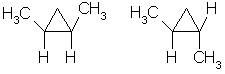 Отсутствие свободного вращения вокруг связей С-С в цикле создает предпосылки для существования пространственных изомеров у некоторых замещенных циклоалканов. Например, в молекуле 1,2-диметилциклопропана две группы СН3 могут находиться по одну сторону от плоскости цикла (цисизомер) или по разные стороны (трансизомер):
