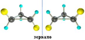 3. Оптическая изомерия некоторых ди- (и более) замещенных циклов. Например, транс-1,2-диметилциклопропан может существовать в виде двух оптических изомеров, относящихся друг к другу как предмет и его зеркальное изображение.