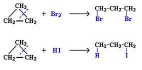 Это приводит к большой напряженности таких циклов и их стремлению к раскрытию под действием реагентов. Поэтому циклопропан, циклобутан и их производные вступают в реакции присоединения, проявляя характер ненасыщенных соединений. Легкость реакций присоединения уменьшается с уменьшением напряженности цикла в ряду: циклопропан > циклобутан >> циклопентан.