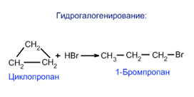 Циклопропан и его производные присоединяют галогены и галогеноводороды: