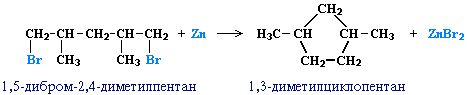 Строение образующегося циклоалкана определяется структурой исходного дигалогеналкана. Этим путем можно получать циклоалканы заданного строения. Например, для синтеза 1,3-диметилциклопентана следует использовать 1,5-дигалоген-2,4-диметилпентан:
