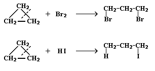 Это приводит к большой напряженности таких циклов и их стремлению к раскрытию под действием реагентов. Поэтому циклопропан, циклобутан и их производные вступают в реакции присоединения , проявляя характер ненасыщенных соединений. Легкость реакций присоединения уменьшается с уменьшением напряженности цикла в ряду: