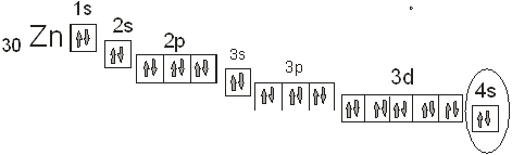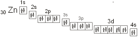 Покажем расположение валентных электронов в атоме цинка. Как видно из электронной формулы цинк относится к d-элементам, поскольку у него заполняется 3d-подуровень.