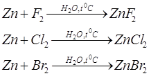 В реакции с галогенами получаем галоген производные цинка: фториды, хлориды, броматы.
