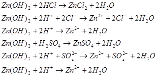 Гидроксид цинка владеет амфотерными свойствами. Он реагирует как с кислотами так и с щелочами. С кислотами гидроксид цинка дает соли цинка, например: