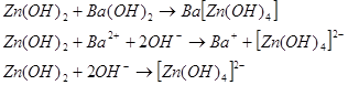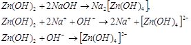 В щелочном растворе гидроокись цинка ведет себя как ангидридокислота, то есть переходит в раствор в виде гидроксоцинкат-ионов за счет присоединения ионов гидроксила. Известны соли три-, тетра- и гексагидроксоцинкатов, например: ![]()