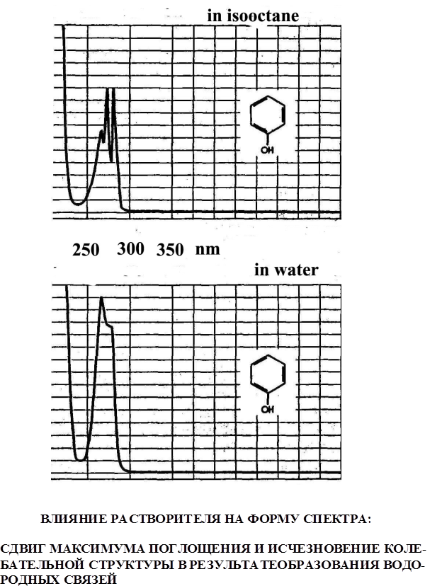 Как известно, во многих случаях в электронных спектрах как в УФ-, так и в видимой области проявляется тонкая колебательная структура. Однако изменение условий регистрации спектра может привести к изменению его положения и формы, в том числе, к исчезновению колебательной структуры. Такое изменение спектра раствора фенола при переходе от растворителя, не образующего с растворенным веществом водородных связей, к растворителю, образующему такие связи, показано на следующем рисунке (рис. F1).