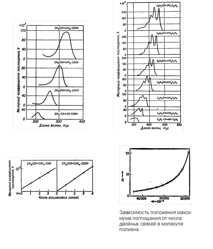 Видно, что с увеличением длины сопряженной системы происходит батохромный сдвиг максимума поглощения и возрастает его интенсивность (коэффициент экстинкции).