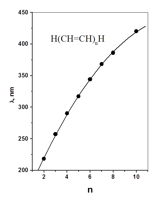Зависимость максима поглощения незамещенного полиена от числа сопряженных связей с=с