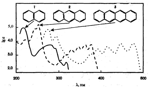 Более наглядно зависимости положения максимума поглощения показаны на рис. F3 (для линейных незамещенных полиенов) и F4 (для замещенных полиенов). Батохромный сдвиг с увеличением протяженности сопряженной системы в ароматических соединениях иллюстрирует рис. F5.