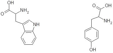Аминокислоты с ароматическими заместителями в боковых цепях, в частности, триптофан и тирозин (рис. F6) ответственны за поглощение белков в области ниже 300 нм. Благодаря присутствию тирозина и триптофана поглощение белков максимально вблизи 280 нм. Это позволяет проводить оценочное определение концентрации белков в очищенных образцах или образцах, не содержащих других компонентов, поглощающих в этой области. Для количественного определения белков после элюирования с хроматографической колонки используется именно поглощение при 280 нм.