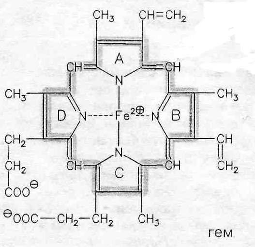 Группа гема состоит из порфиринового цикла с координированным в центре ионом железа (рис. А6). Она является простетической группой гемоглобинов, миоглобина, гидропероксидаз и значительного числа цитохромов. Системе сопряженных связей порфиринового цикла соответствует интенсивное поглощение из трех полос, обозначаемых как a, b и g. Обычно a-полоса - самая длиннолволновая и расположена в интервале 550 – 650 нм, g-полоса – самая коротковолновая, а b-полоса расположена между ними. На рис. F7 показан спектр восстановленной (FeII ) формы цитохрома С, выделенного из сердца лошади. Отмечены полосы a (550,5 нм) и b (520,5 нм). Образование координационных комплексов гемового железа цитохромов, глобинов, оксигеназ и гидропероксидаз с различными лигандами сопровождается характернами изменениями спектров поглощения. Например, связывание окиси углерода восстановленной формой гема может быть прослежено по изменению электронного спектра поглощения. Метод обычно используется при изучении реакций этого типа.