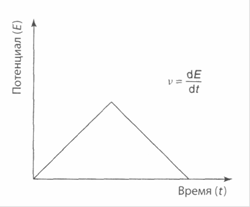 По мере восстановления на поверхности электрода окисленной формы Ох образуется восстановленная форма R, которая переходит обратно в раствор. При обратной развертке потенциала вблизи значения Е, равного окислительно-восстановительному потенциалу пары Ox-R, восстановленная форма вновь окисляется с образованием Ох. Ток при этом начинает возрастать в противоположном направлении до тех пор, пока не достигнет пикового значения. Подобный метод исследования называют циклической вольтамперометрией. На рисунке показано, как в этом методе изменяется наложенный на электроды потенциал в зависимости от времени.
