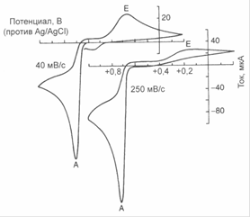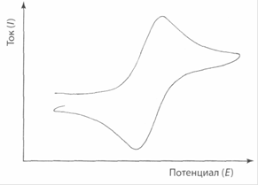 На типичной циклической вольтамперограмме видны два пика. Один из них отражает восстановление исходной окисленной формы, а другой - реокисление восстановленной формы с образованием исходного вещества. Пиковые токи практически одинаковы по величине, а соответствующие им потенциалы сдвинуты друг относительно друга на 0,056/nВ. Независимо от концентрации Ох, коэффициентов диффузии или скоростей электронного переноса, среднее арифметическое этих потенциалов равно стандартному окислительно-восстановительному потенциалу Е° пары Ox-R.