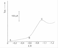 В начале кривой (точка А) ток небольшой. Между точками А и В очень медленный подъем кривой обусловлен остаточным (или примесным) током и зарядкой двойного слоя на границе электрода с раствором. Этот ток иногда называют фоновым. В точке В наложенный потенциал приближается к потенциалу восстановления частиц, находящихся в окисленном состоянии (Ох). При дальнейшем увеличении потенциала электроны с возрастающей скоростью переходят с электрода на Ох в соответствии со следующим уравнением реакции: