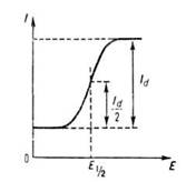где R-газовая постоянная, Т-абсолютная температура, E1/2 -потенциал полуволны, т.е. потенциал, соответствующий половине высоты волны (Id /2;). Значение E1/2 характерно для данного электроактивного вещества и используется для его идентификации. Когда электрохимические реакции предшествует адсорбция определяемого вещества на поверхности электрода, на вольтамперограммах наблюдаются не волны, а пики, что связано с экстремальной зависимостью адсорбции от потенциала электрода. На вольтамперограммах, зарегистрированных при линейном изменении (развертке) потенциала со стационарным электродом или на одной капле капающего электрода (устар. - осциллографич. полярограмме), также наблюдаются пики, нисходящая ветвь которых определяется обеднением приэлектродного слоя раствора электроактивным веществом. Высота пика при этом пропорциональна концентрации электроактивного вещества. В полярографии предельный диффузионный ток (в мкА), усредненный по времени жизни капли, описывается уравнением Ильковича: