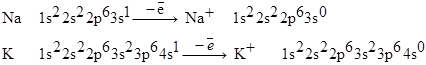 В результате ионизации образуются катионы Э+ , имеющие устойчивую конфигурацию благородных газов.