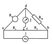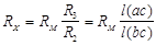 Положение передвижного контакта "с" подбирается так, чтобы нуль-инструмент 2 не показывал ток (или ток был минимален), тогда сопротивление ячейки RX можно рассчитать по формуле