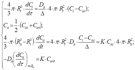 де Сi – концентрація олії в клітинах зерна; Ri – радіус сфери, яка містить цільовий компонент з концентрацією Сi ; τ – час екстрагування; DΔ – коефіцієнт стислої дифузії крізь область зародка; Δ – товщина області, в якій розташований зародок; Сan – концентрація речовини на межі фазового контакту частинки з розчинником; Сas – концентрація на межі мембранна перегородка – зародок.