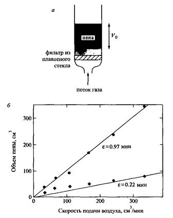 Рис. 1. Пенообразование по методу Бикермана: газ непрерывно пропускается через жидкость, находящуюся в колонке; зависимость объема пены от скорости подачи газа.
