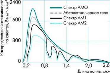 На рис.1 показано спектральное распределение интенсивности солнечного излучения в различных условиях. Верхняя кривая (АМ0) соответствует солнечному спектру за пределами земной атмосферы (например, на борту космического корабля), т.е. при нулевой воздушной массе. Она аппроксимируется распределением интенсивности излучения абсолютно черного тела при температуре 5800 К. Кривые АМ1 и АМ2 иллюстрируют спектральное распределение солнечного излучения на поверхности Земли, когда Солнце в зените и при угле между Солнцем и зенитом 60°, соответственно. При этом полная мощность излучения – соответственно порядка 925 и 691 Вт/м2
