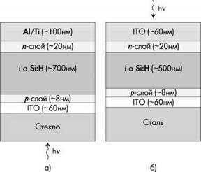 | Рис.8. р-i-n-Структура на стеклянной (а) и стальной (б) подложке |