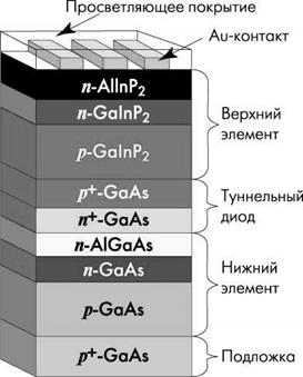На рис.15 изображена каскадная батарея, в которой верхним элементом служит структура на основе GaInP c n-AlInP в качестве окна, далее следует туннельный диод на GaAs для прохождения носителей между элементами и нижний элемент из GaAs.