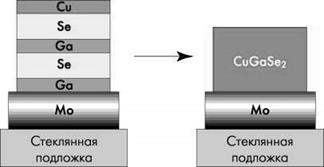 CuGaSe2 также весьма интересен как тонкопленочный элемент солнечных батарей. Благодаря запрещенной зоне шириной 1,68 эВ он используется как верхний элемент тандемной солнечной батареи с нижним элементом из CuInSe2. Слои CuGaSe2 формируют путем последовательного осаждения термическим испарением тонких слоев Ga, Se и Cu на поверхность стеклянной подложки, покрытой слоем молибдена толщиной 1 мкм (рис.11). Далее из полученной структуры в установке быстрого термического отжига в течение пяти минут при температуре 550°С получают соединение CuGaSe2.