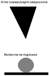 Идея сканирующей туннельной микроскопии проста (рис. 1) - игла туннельного микроскопа направлена на молекулу, расположенную на поверхности твердого тела. Расстояние между иглой и молекулой должно быть больше, чем размеры молекулы, чтобы не перекрывались атомные орбитали острия и поверхности. Между острием иглы и поверхностью подают напряжение. В какой-то момент напряжение, а значит, и энергия туннелирующих электронов попадает в резонанс с электронно-колебательными уровнями адсорбированной молекулы, и происходит резкий скачок проводимости. Значение напряжения, при котором происходит скачок туннельного тока, строго индивидуально для каждой молекулы, а потому дает ее точный «портрет».