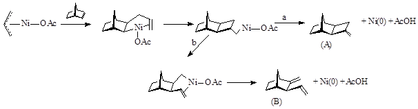 Этот процесс включает гидридное элиминирование после встраивания молекулы субстрата по связи Ni – аллил. В присутствии НБН образуется интермедиат А cis, exo – строения. Далее происходит замыкание четырехчленного кольца (направление a), с образованием cis, exo продукта I, имеющего метиленциклобутановый фрагмент. Реакция может реализовываться по направлению b с образованием продукта II (exo), имеющего метиленовую и винильную группу.