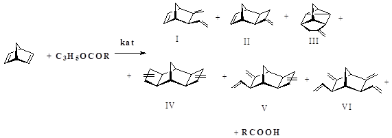 Многие продукты аллилирования НБД аллилформиатом и аллилацетатом имеют одинаковое строение. Это моноаддукты I – III, характеризующиеся молекулярной массой 132, и пространственные изомеры продуктов двойного аллилирования НБД IV – VI с массами 172 (таблица 3).