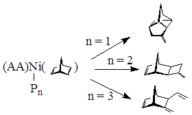 Общий характер диспропорционирования водорода между η3-аллильными лигандами подтвержден для комплексов различных переходных металлов Со, Fe, Ni, Rh, Pd и Pt. Из данных таблицы видно, что строение аддуктов определяется закономерностями, присущими и другим процессам циклоприсоединения с участием НБД 12313131. Так, при использовании комплексов никеля, палладия и платины образуются соединения, имеющие двойную связь в норбоненовом кольце. Этот факт предполагает монодентатный характер координации НБД в комплексах переходных металлов подгруппы никеля. Близость соотношений продуктов для этих металлов указывает на сходство их координационных возможностей. Однако активность комплексов в изучаемой реакции существенно уменьшается от никеля к платине, что связано с возрастанием эффективного положительного заряда металла в этом ряду.