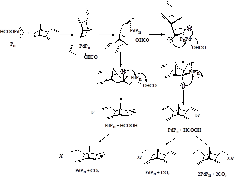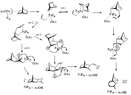Механизм реакции основан на известных свойствах η3-аллильных комплексов: η3→ η1-изомеризации аллильных лигандов, внедрении ненасыщенных молекул по η1-связи металл-углерод, стадиях β-элиминирования и гидридного переноса, а также способности молекулы НБД как к монодентатной, так и хелатной координации.