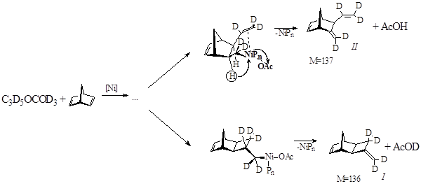 Ключевая стадия – β-гидридный перенос - подтверждается хромато-масс-спектрометрическим исследованием продуктов модельных систем: Ni(C3D5) 2 – НБД и Ni(С3Н5) 2 – НБД-D8. Их строение указывает на участие в процессе атомов водорода, принадлежащих как НБД, так и аллильному фрагменту и занимающих β-положение по отношению к металлу (рис.1.2).