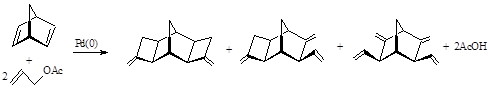 Строго говоря, взаимодействие НБН и аллилацетата не является содимеризацией. Аллилацетат выступает лишь как источник фрагмента С3Н4, присоединяющегося к НБН при помощи каталитического комплекса. Эта реакция является первым примером использования аллиловых эфиров органических кислот в подобных процессах и представляется интересным методом получения полициклических соединений.